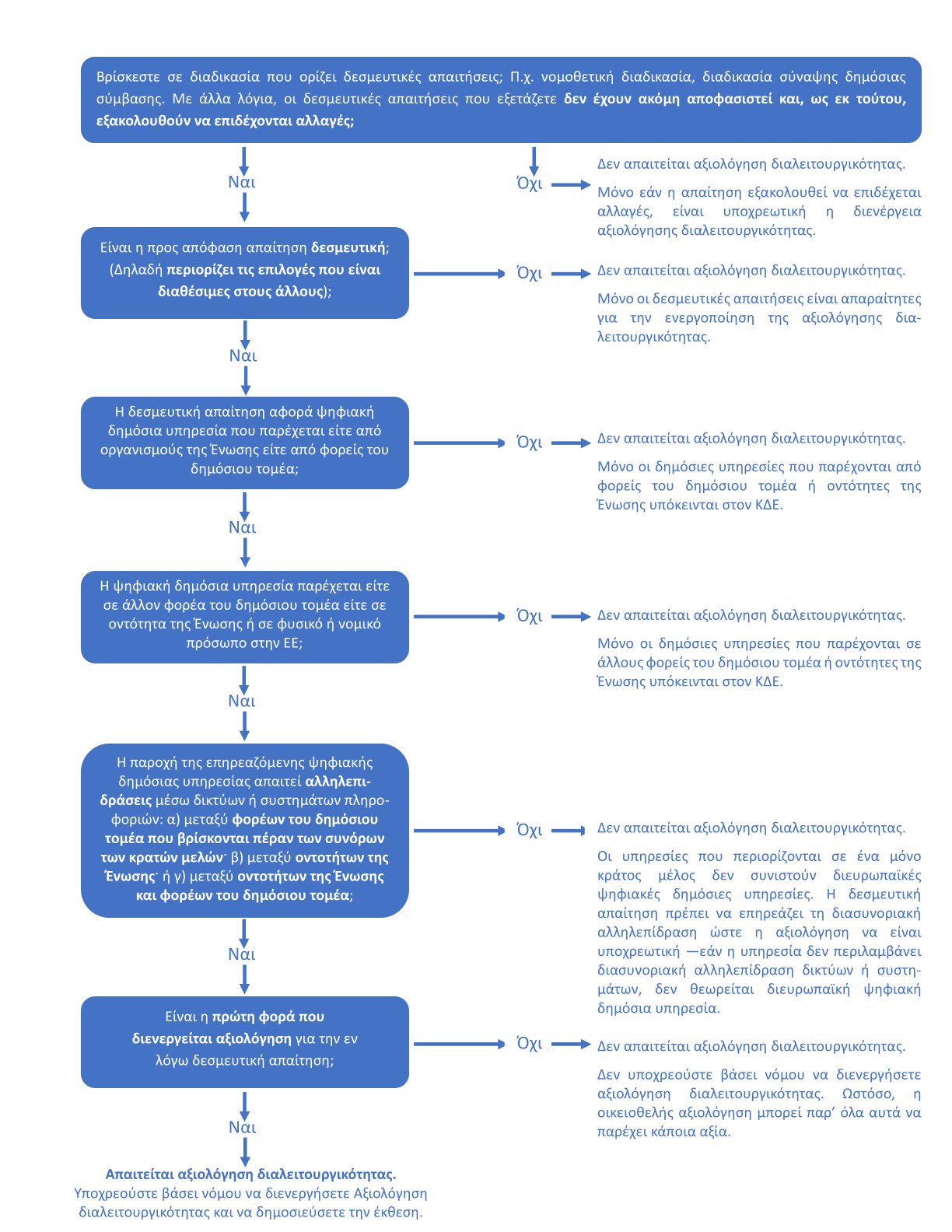 Το παρακάτω δεντροδιάγραμμα λήψης αποφάσεων μπορεί να χρησιμοποιηθεί ως βάση προκειμένου να διαπιστωθεί αν απαιτείται αξιολόγηση διαλειτουργικότητας ή όχι. Εάν η αρχή καταλήξει στο «Ναι» στο δενδροδιάγραμμα αποφάσεων, η αξιολόγηση διαλειτουργικότητας είναι υποχρεωτική. Αν καταλήξει σε “Όχι” η αξιολόγηση διαλειτουργικότητας δεν είναι υποχρεωτική.
